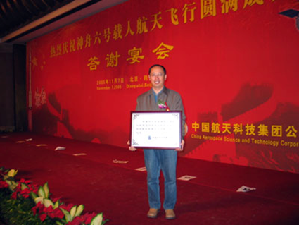 2005年,中國航天科技集團為感謝銀利電器為我國神舟六號載人航天飛行任務(wù)飛船和運載火箭研制配套中作出的貢獻,邀請公司董事長焦海波先生參加慶祝“神舟六號載人航天飛船飛行圓滿成功”答謝宴會,并頒發(fā)榮譽證書。